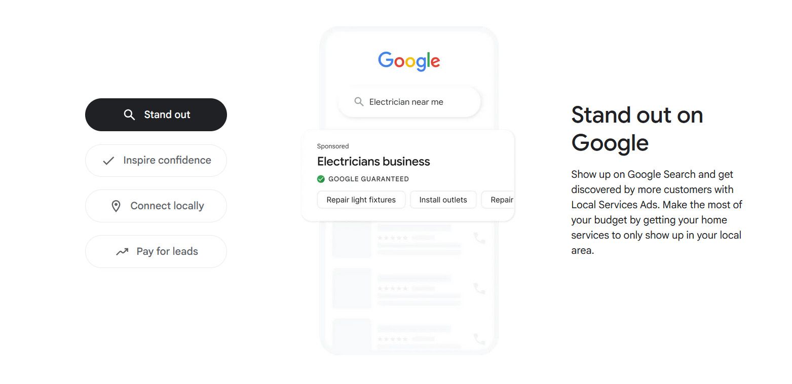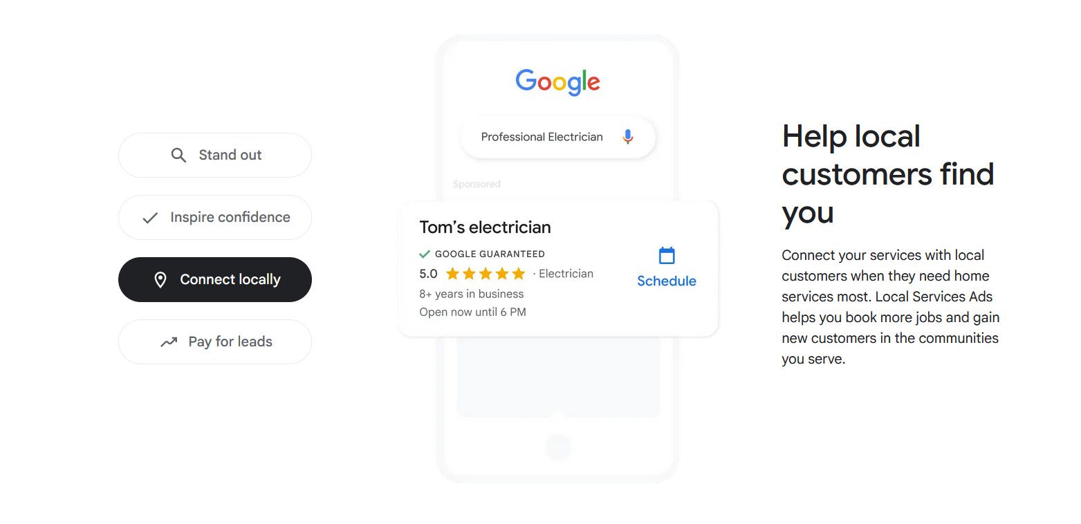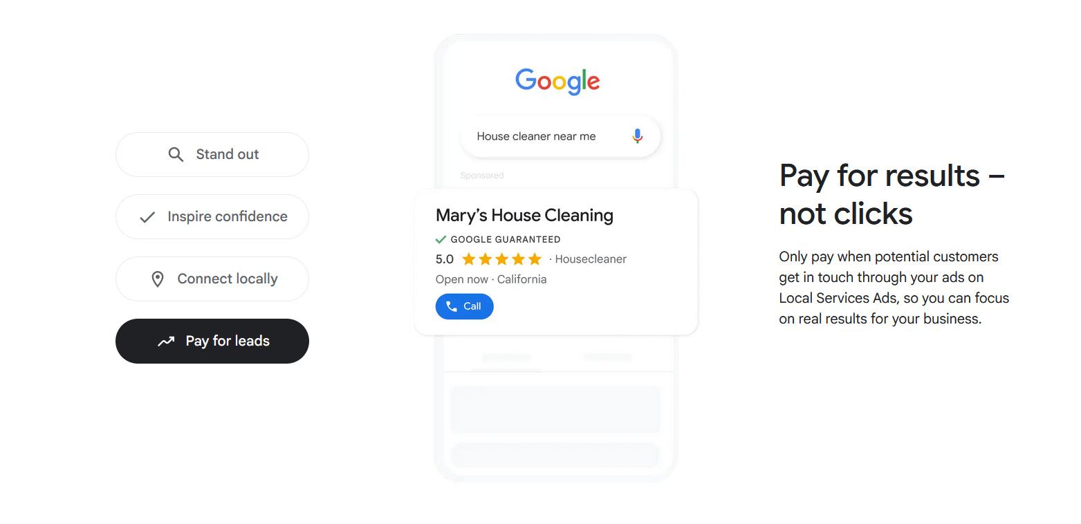 Show up when local customers search for your services, and build confidence with a Google badge. With Local Services Ads, you only pay for customers — not clicks.